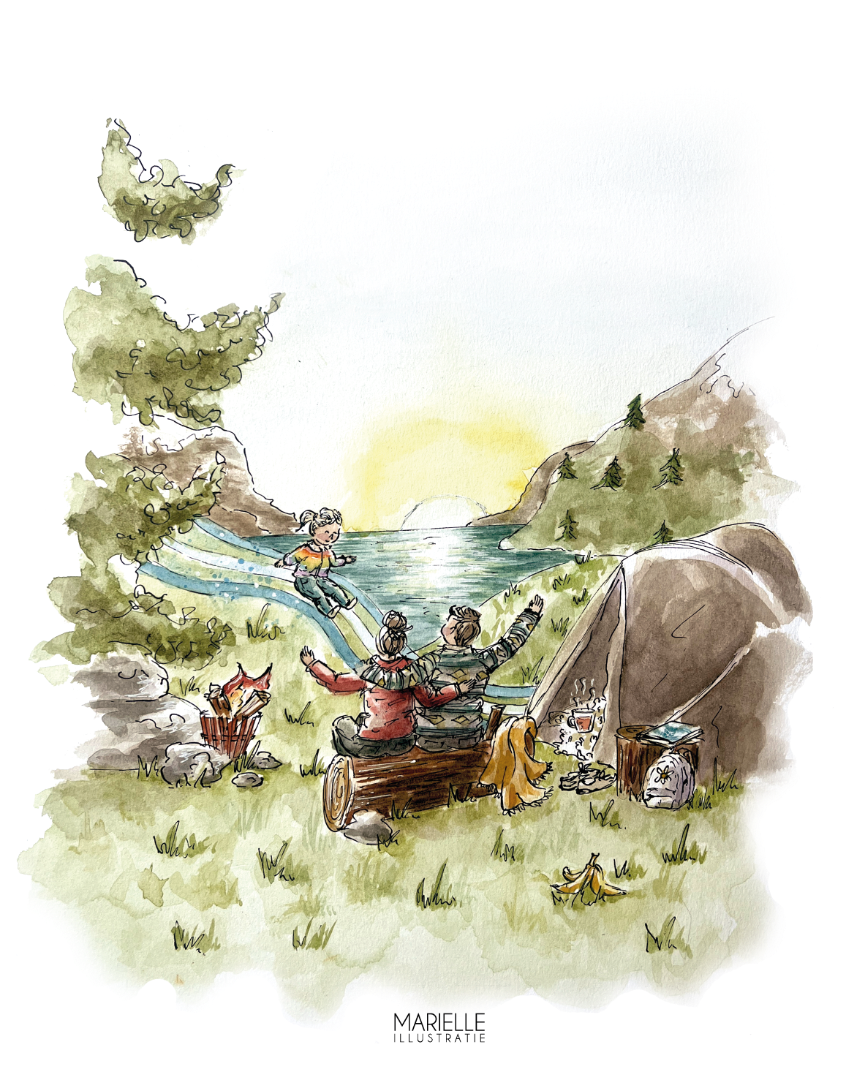 Omgeving, sfeer, glijbaan met kindje, boomstronk met boek, tent, thee, hardloopschoenen en zélfs de bananenschil.