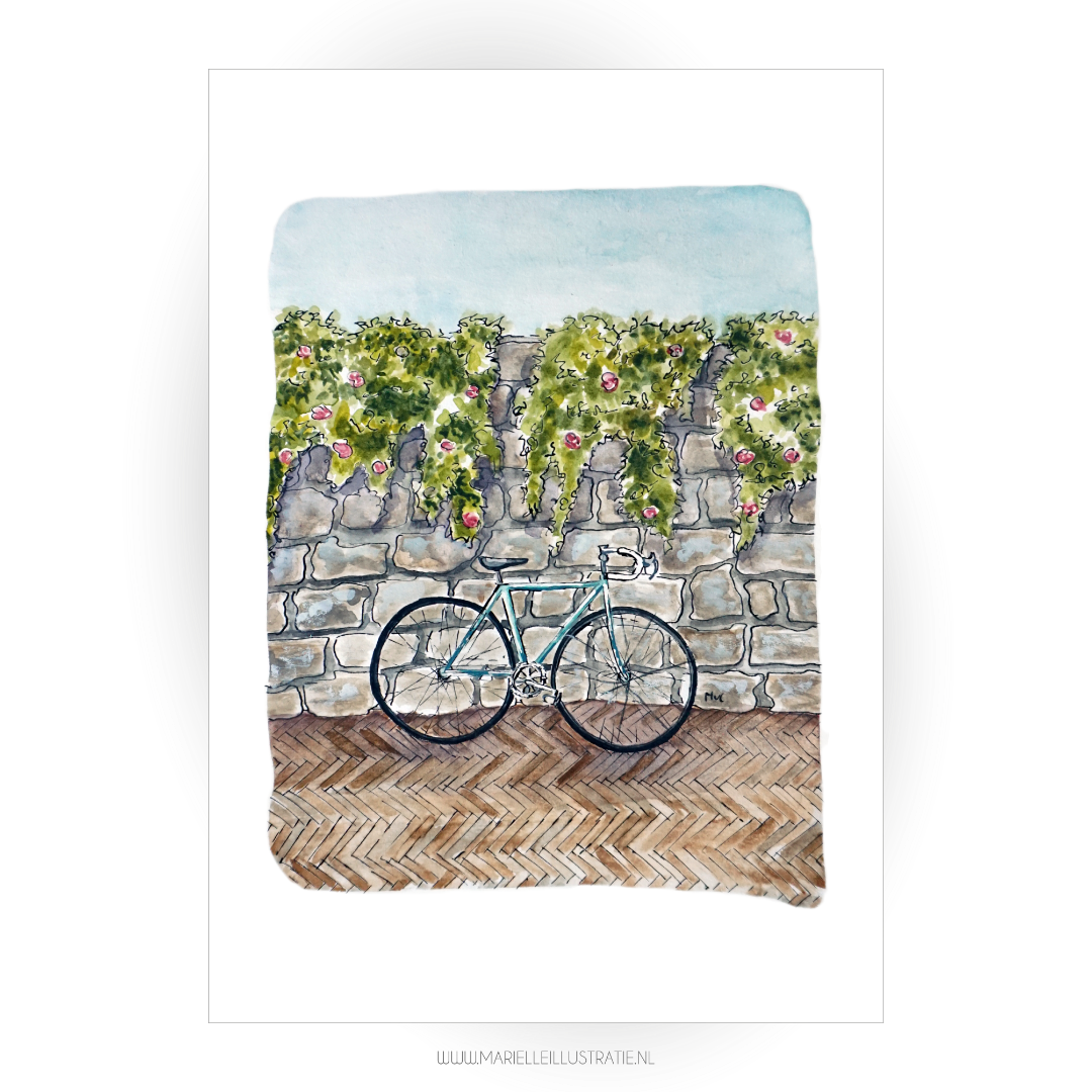 Illustratie van een racefiets voor een stenen wand met hangende planten.