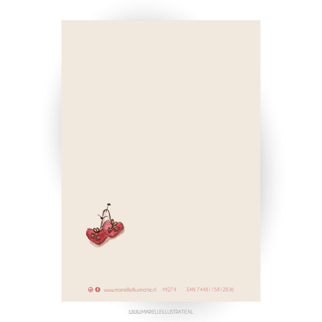 Wenskaart bevat rechte hoeken. Op de achterzijde is minimale informatie van de kaart zichtbaar en lieve babysokjes.