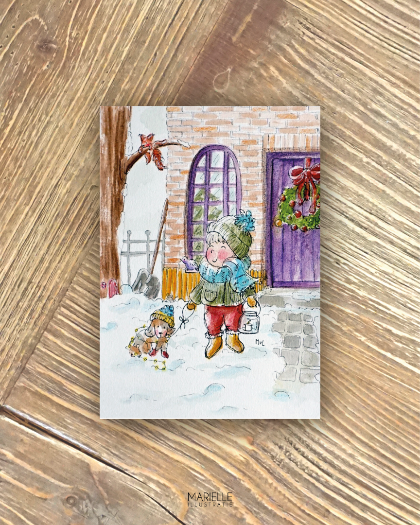 Met zijn kaarsje en hondje gaat hij wandelen in de sneeuw.
