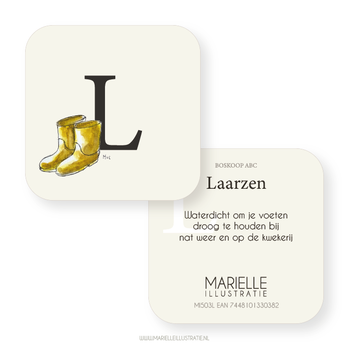 Aan de voorzijde staat de letter met een illustratie, aan de achterzijde de betekenis van de illustratie per letter.